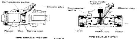 piston, piston cup, compression spring dan lain lain, lihat gambar di bawah. Pada setiap roda biasanya nmenggunakan satu atau dua buah silinder roda, tergantung pada tipe rem tromol yang digunakan. Berikut ini gambar dari wheel cylinder dengan satu piston dan dua piston.